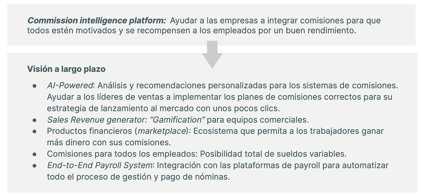 La categoría de sales commission ha sido creada por Xactly, empresa fundada 2005 y donde, 10 años más tarde, han aparecido competidores con productos más innovadores y adaptados a los requerimientos actuales. Xactly (EEUU) adquirida por Vista Equity Partners se encuentra con unos $100M de ARR y valida la oportunidad.