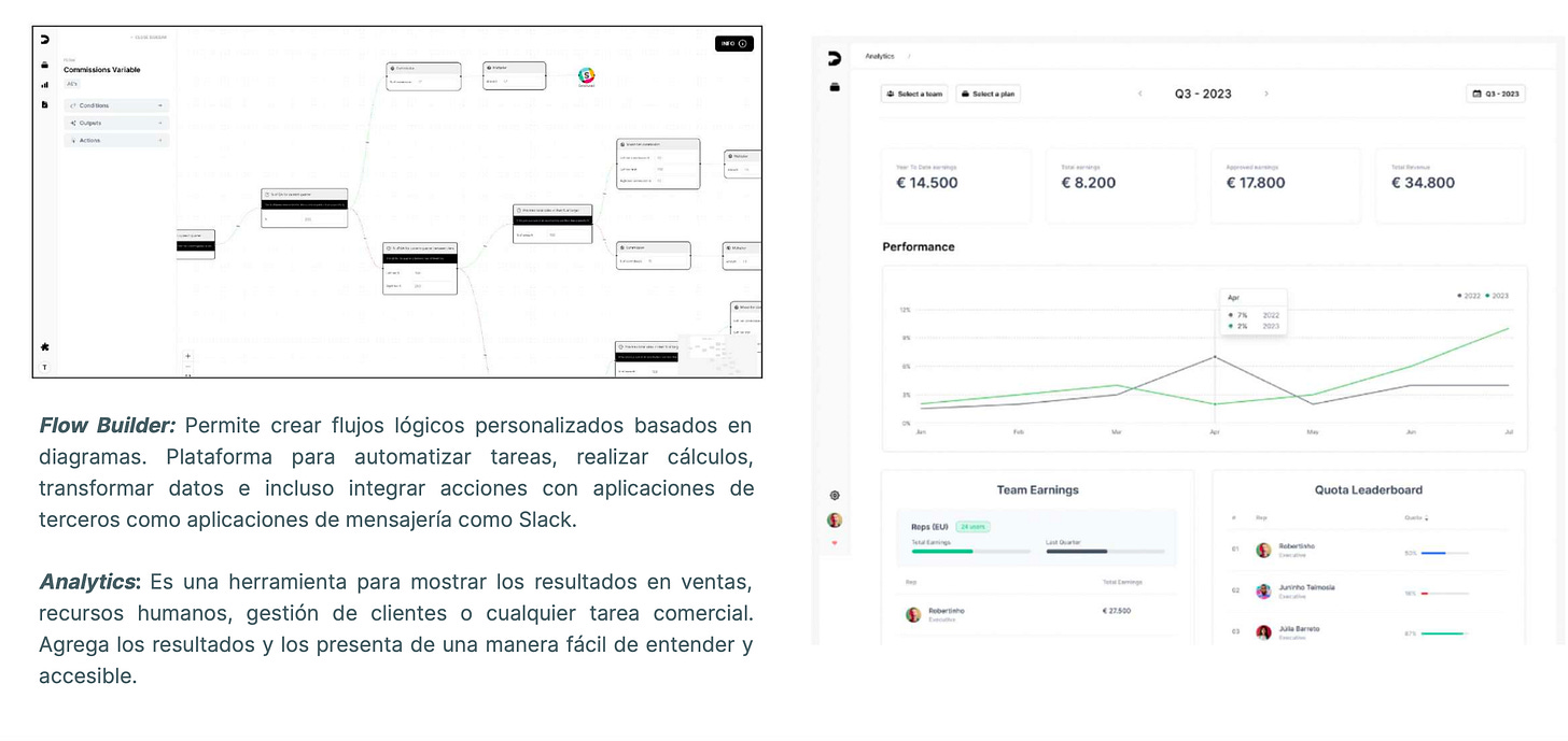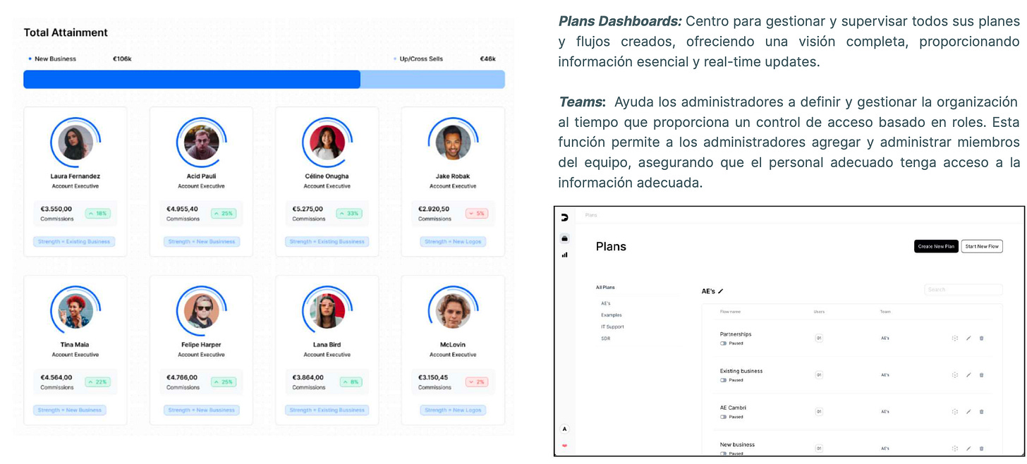 El software ayuda a las empresas a gestionar los planes de comisiones de los empleados. La plataforma cuenta con distintas funcionalidades como el Flow Builder (herramientas para gestionar y automatizar cálculos y asignaciones), análisis de datos, dashboards para visualizar status en tiempo real y otras herramientas para administradores y organización.