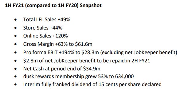 Dusk es una empresa con unos productos de nicho pasando por un buen momento y con una cuota de mercado del 22%. Un modelo de negocio poco intensivo de capital y con oportunidad de crecimiento que le permite ir abriendo tiendas a lo largo de Australia y con una base de clientes que cada vez es mayor.